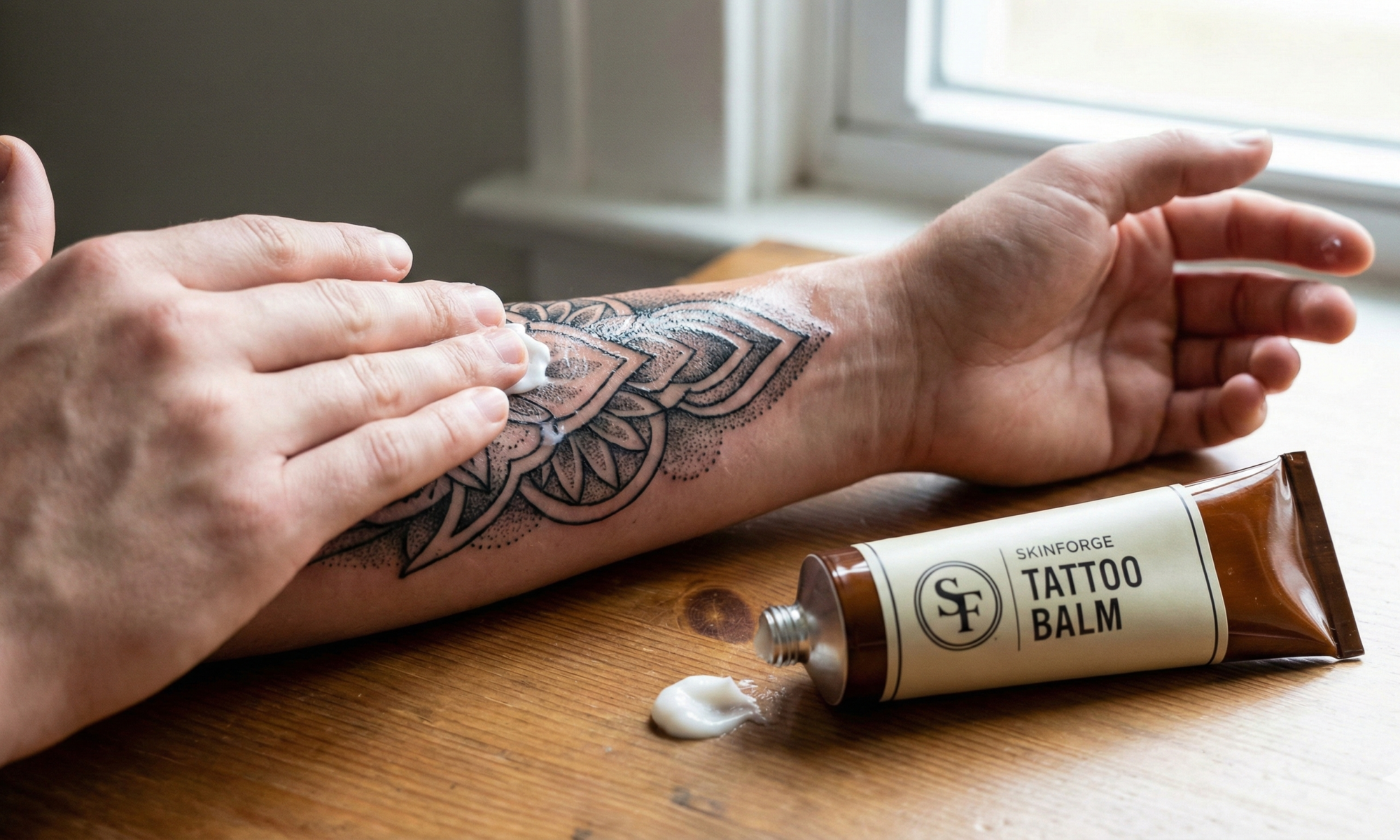 Dry the tattoo with kitchen paper (NOT a towel, as it contains germs). Once it is completely dry, apply a very thin layer of special cream (e.g. Bepanthol or special tattoo cream). The skin must be able to breathe.